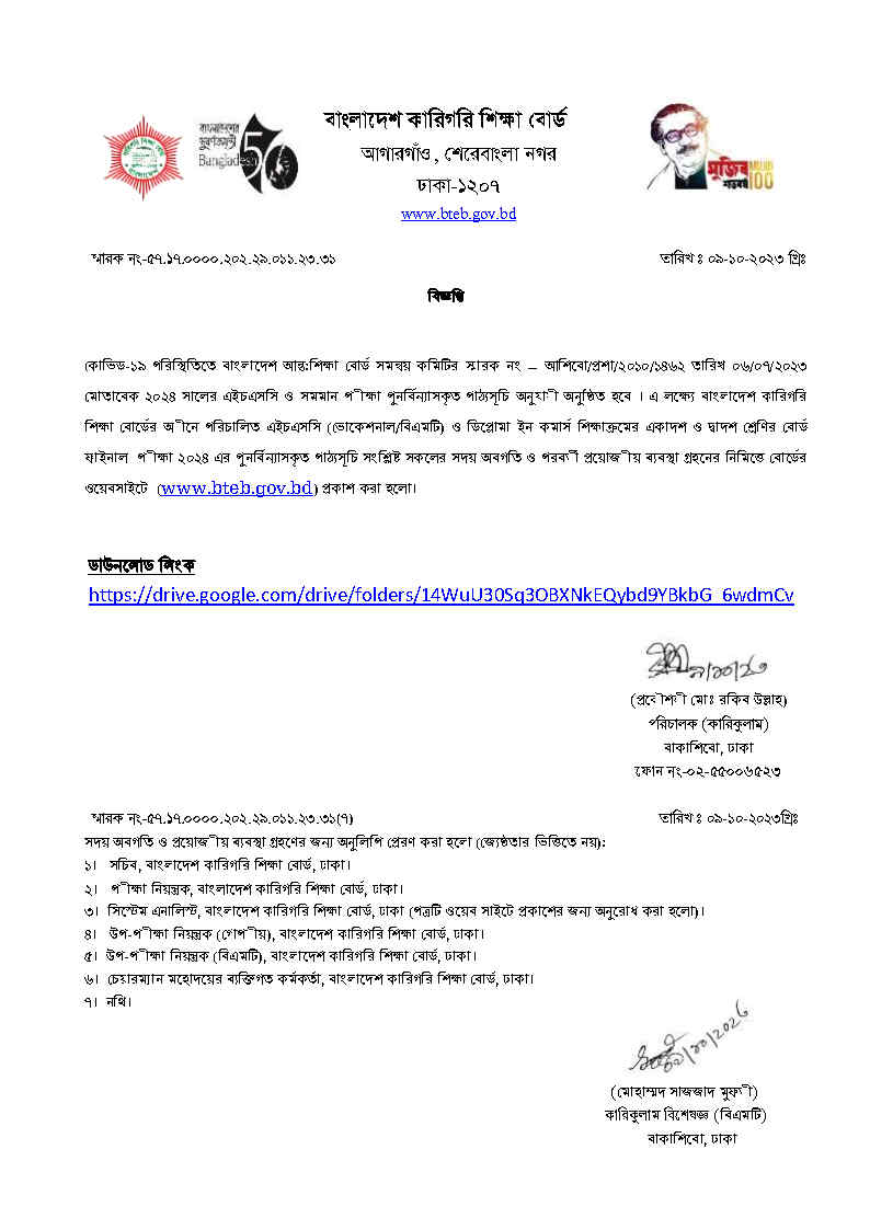 ২০২৪ সালের এইচএসসি ('বিএমটি) একাদশ ও দ্বাদশ শ্রেণির বোর্ড ফাইনাল পরীক্ষার পুনর্বিন্যাসকৃত পাঠ্যসূচি , October 10, 2023