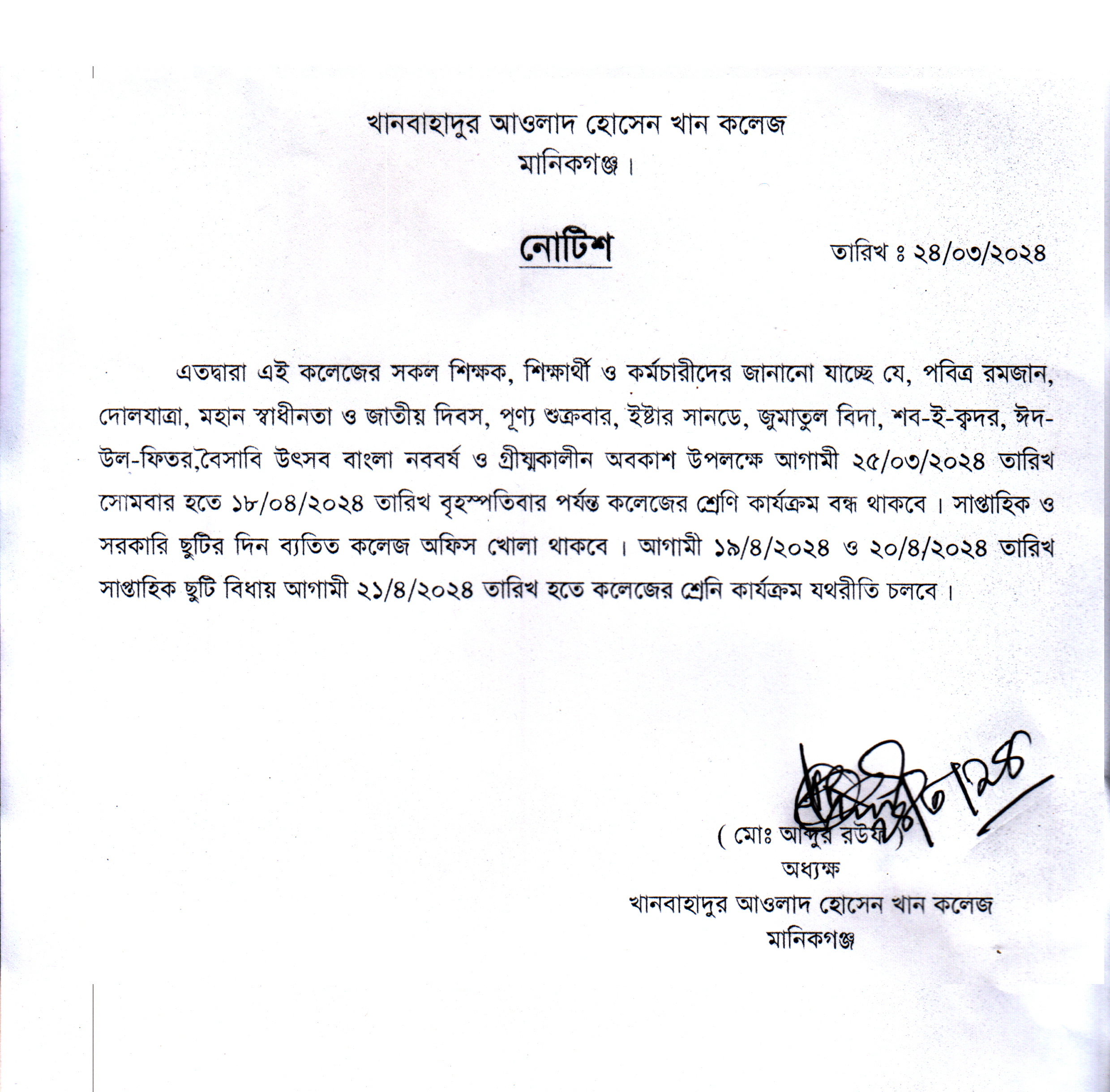 ২৫.০৩.২০২৪ থেকে ১৮.০৪.২০২৪ তারিখ পর্যন্ত শ্রেণি কার্যক্রম বন্ধ প্রসঙ্গে, March 24, 2024